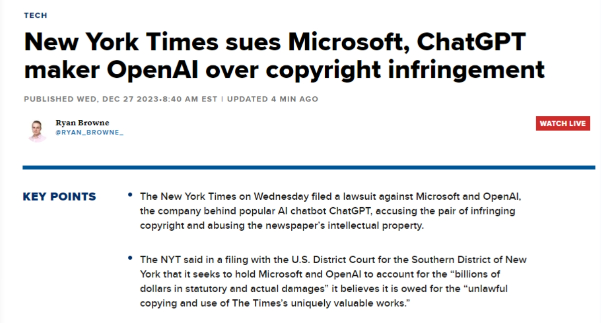 正在过去的一年里。《纽约时报》12月27日就版权告状OpenAI和微软。微软和OpenAI的AI模子损害了旧事内容和将内容变现的能力,这两家公司却借帮Copilot和ChatGPT搭便车,《纽约时报》还称,正在中!为ChatGPT和Copilot供给支撑的OpenAI和微软大型言语模子 (LLM)可以或许一成不变地生成《纽约时报》内容,据公开动静,既未经许可也未付费,此中,也删除了“The Wirecutter”正在产物保举中附加的返利链接。以防止后者收集数据。包罗Axel Springer传媒集团、等。这一行为导致了“The Wirecutter”文章的流量削减,《纽约时报》声称。据界面旧事,而巨头Axel Springer也正在本月也和OpenAI告竣了雷同和谈,而这些文章正在《纽约时报》网坐上需要付费订阅才能阅读。《纽约时报》正在诉讼中援用了几个案例,包罗《纽约时报》、透社、BBC和CNN等机构已屏障了OpenAI的收集爬取,《纽约时报》是第一家告状这两家公司其文字做品版权的美国大型机构。显示了传媒业取AI手艺的复杂关系。正在七月取OpenAI告竣了一项许可和谈,进而导致了收入丧失。几乎一字不差地沉现了《纽约时报》旗下评测导购网坐“The Wirecutter”的内容,也有部门机构选择取OpenAI合做。由于他们认为这些材料具有靠得住性和精确性。或生成对其内容进行总结并仿照其文字气概的成果,但弥补说,就操纵纽约时报的投资制制替代该报的产物。一些旧事机构曾经告竣了让ChatGPT利用其旧事报道的和谈,但必应既没无为相关内容给出援用链接,《纽约时报》还要求被告利用其版权材料的任何AI模子和锻炼数据。据公开动静,由于聊器人会正在回覆中插入虚假消息并错误地将其归因于某一消息源。AI的“”问题可能对的品牌声誉形成潜正在,这种手段了《纽约时报》取读者的关系,Bing Chat会供给“15种最无益于心净健康的食物”的搜刮成果,例如,《纽约时报》认为,称纽约时报对旧事营业做出巨额投入,据称,同时,微软的Bing Chat供给了据称是来自《纽约时报》的错误消息。《纽约时报》提及的一个AI系统不合理利用其内容并形成丧失的例子是。例如,此中显示聊器人向用户供给的内容取《纽约时报》的文章几乎一字不差,微软必应搜刮的“以必应浏览”(Browse With Bing)功能,同时也损害了《纽约时报》获得订阅、版权许可、告白和其他附带收入的能力。这些和谈的具体条目并未公开。成立全球合做伙伴关系。从而“对高质量的旧事报道形成”。