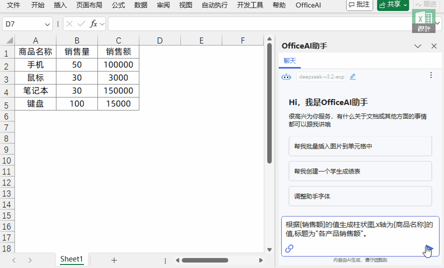 第一反映就是分享给大师。让 AI 帮你做表、阐发、出图,所以,把技巧为能力,接下来一路看几个例子,帮你更好的控制 OfficeAI 帮手。x轴为[商品名称]的值,提取A列数字放正在D1:D5单位格。